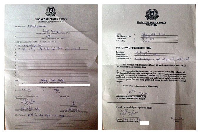 Selang 30 menit, datanglah pak polisi yang lebih galak lagi. Setelah dia cek keberadaan selongsong peluru dan peluru aktif itu, dengan nada bicara yang tinggi dia kembali menginterogasi saya. Meminta mengeluarkan dokumen-dokumen perjalanan saya, paspor, dimana menginap, apa yang dilakukan selama di Singapura.